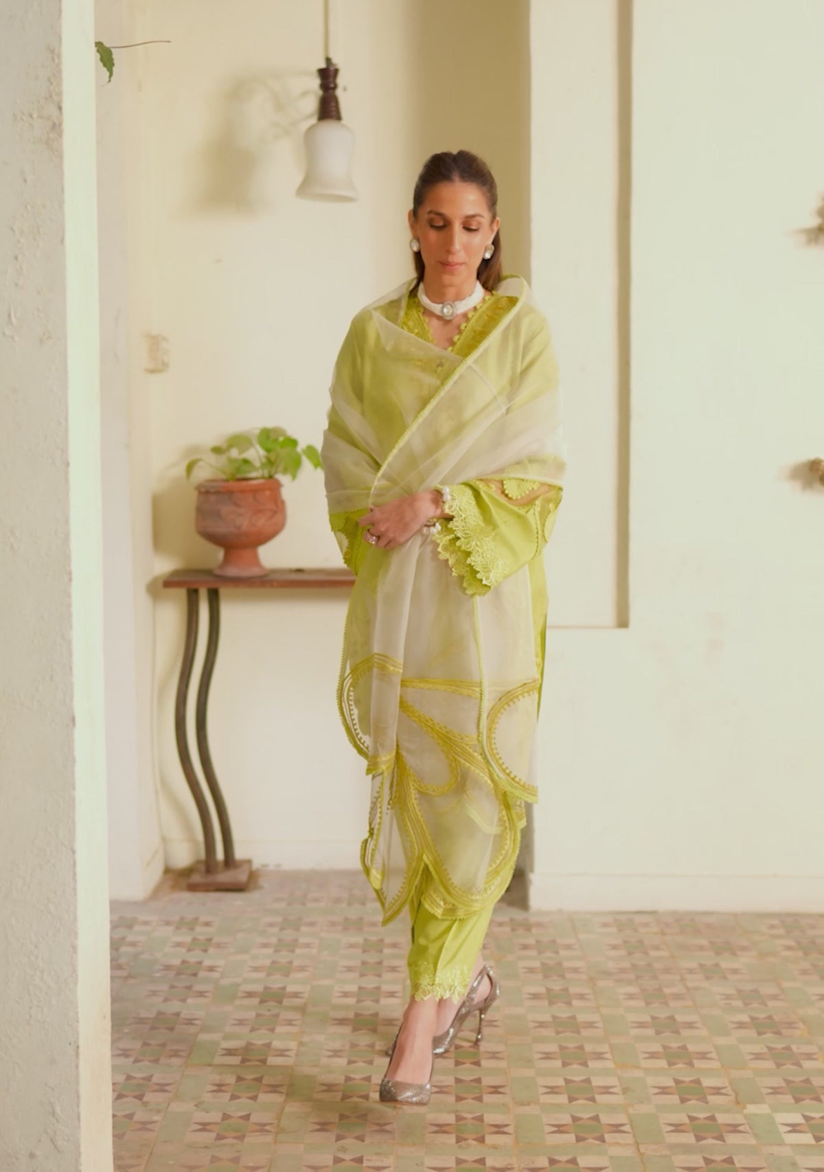 Dina, the lime oversized kurta comes with floral embroideries on the neck, side panes and sleeves. It is paired with a matching shalwar and a contrasting white dupatta with exaggerated floral motifs on the pallus.