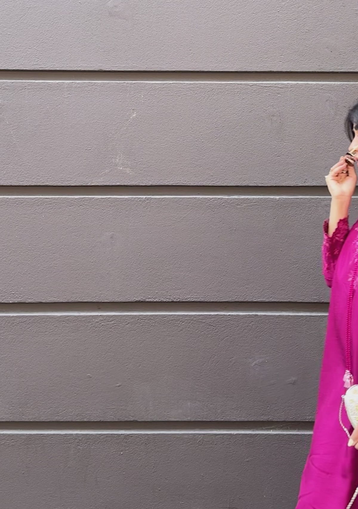 Elaheh, the magenta column-cut kaftan comes with intricate embroideries throughout its edges. The kaftan has batwing sleeves and a contrasting tassel on the neck.