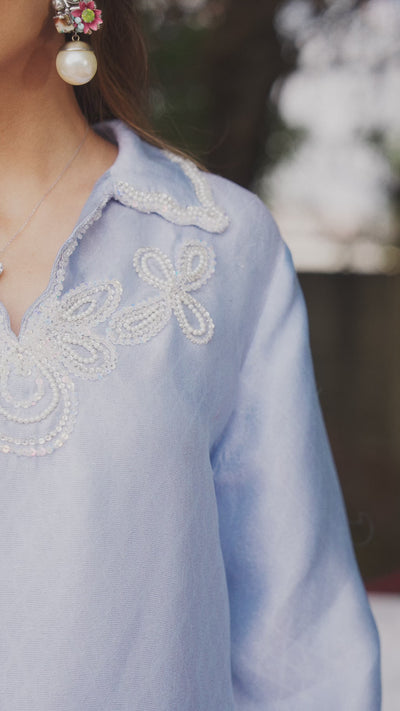 Emani, the periwinkle pure self seesha silk kurta comes with a cool collar and baggy sleeves with pearl, crystal and sequin deatiling on the neck. It is paired with a pure sheesha silk shalwar and pleated organza dupatta.
