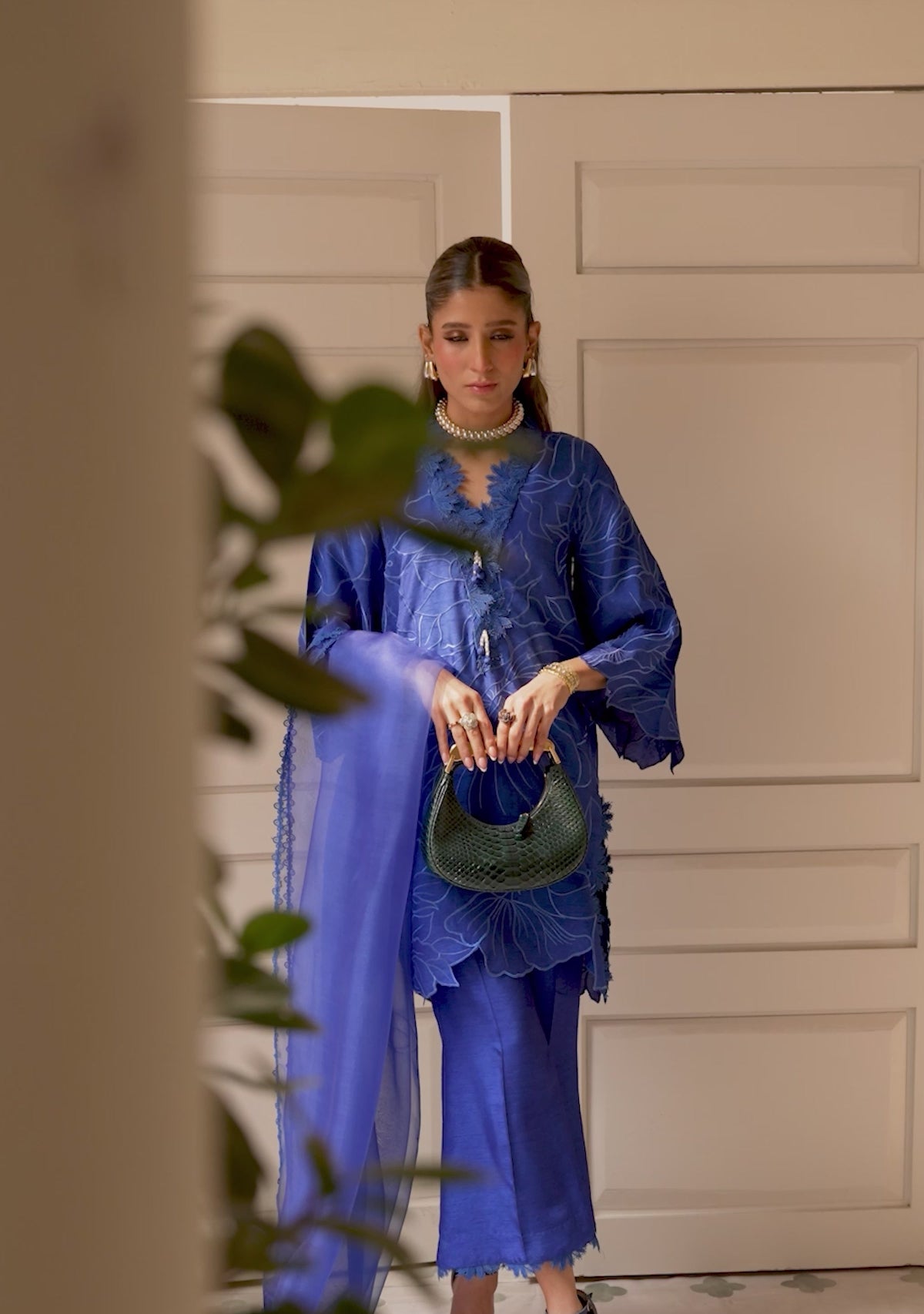 Gul, the cobalt blue short shirt with exaggerated floral motifs is made in pure bamber raw silk with cutwork edges on its hem and sleeves. It is paired with matching culotte cut pants and pure organza dupatta.