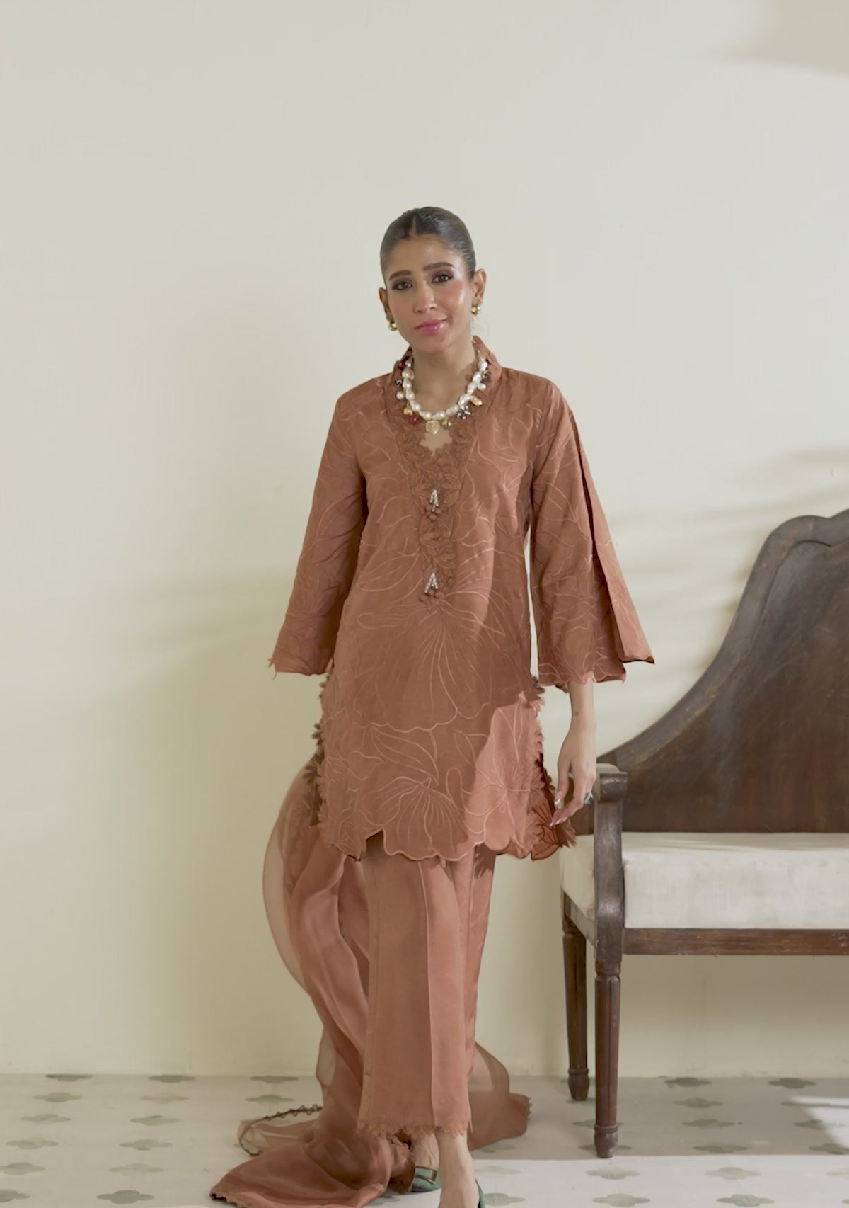 Gul, the mocca short shirt with exaggerated floral motifs is made in pure bamber raw silk with cutwork edges on its hem and sleeves. It is paired with matching culotte cut pants and pure organza dupatta.