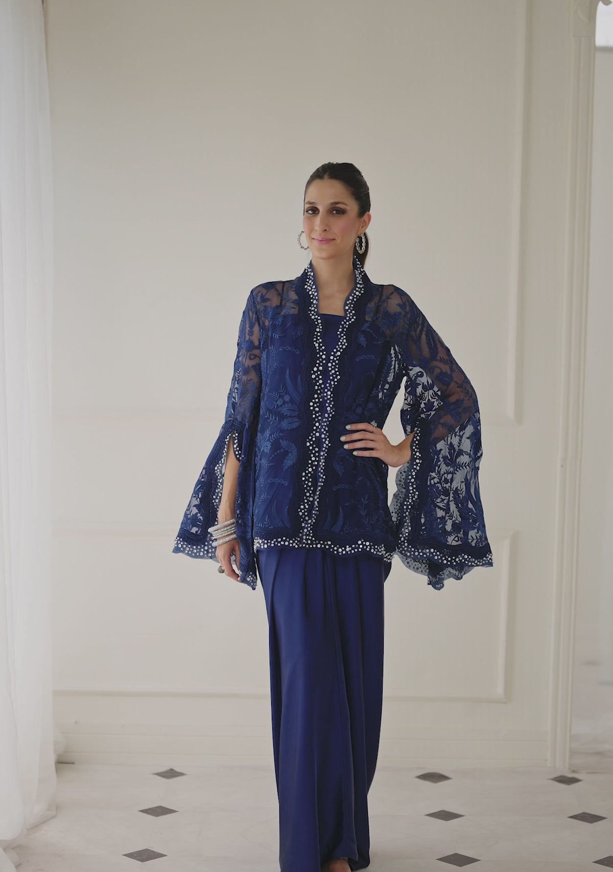 Mina, the royal blue silhouette comprises of a pure organza embroidered cape with delicate beading for the perfect glam look. The cape is paired with an asymmetrical silk sarong skirt and slip.