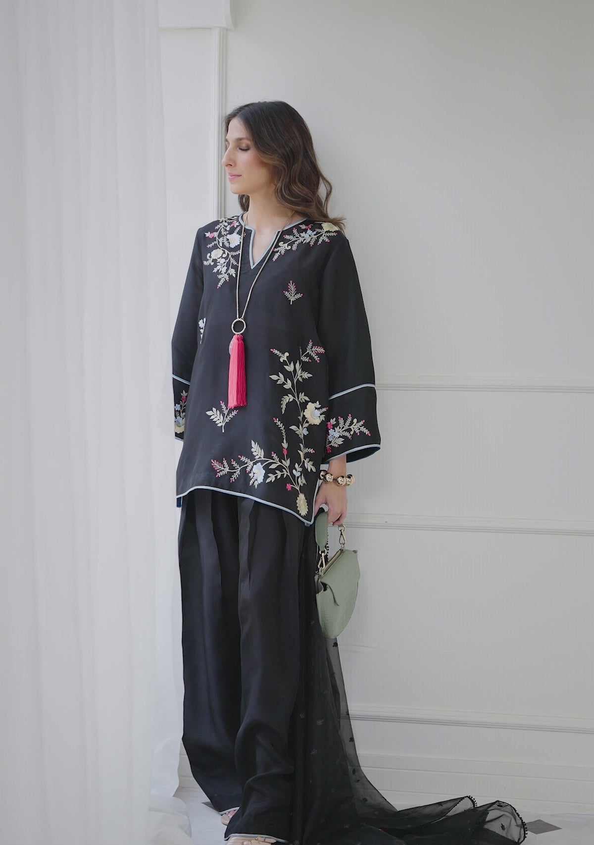 Soha, the black oversized short kurta is adorned with intricate embroideries in pops of color throughout the kurta. The set is made in tassel silk and comes with a kharri shalwar and an organza shoulder drape dupatta with embroidered motifs.