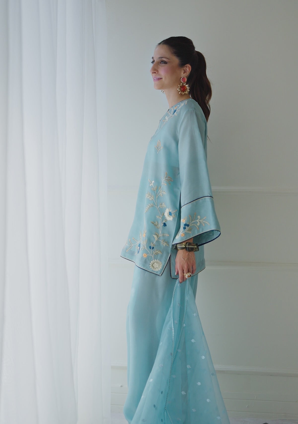 Soha, the sky blue oversized short kurta is adorned with intricate embroideries in pops of color throughout the kurta. The set is made in tassel silk and comes with a kharri shalwar and an organza shoulder drape dupatta with embroidered motifs.