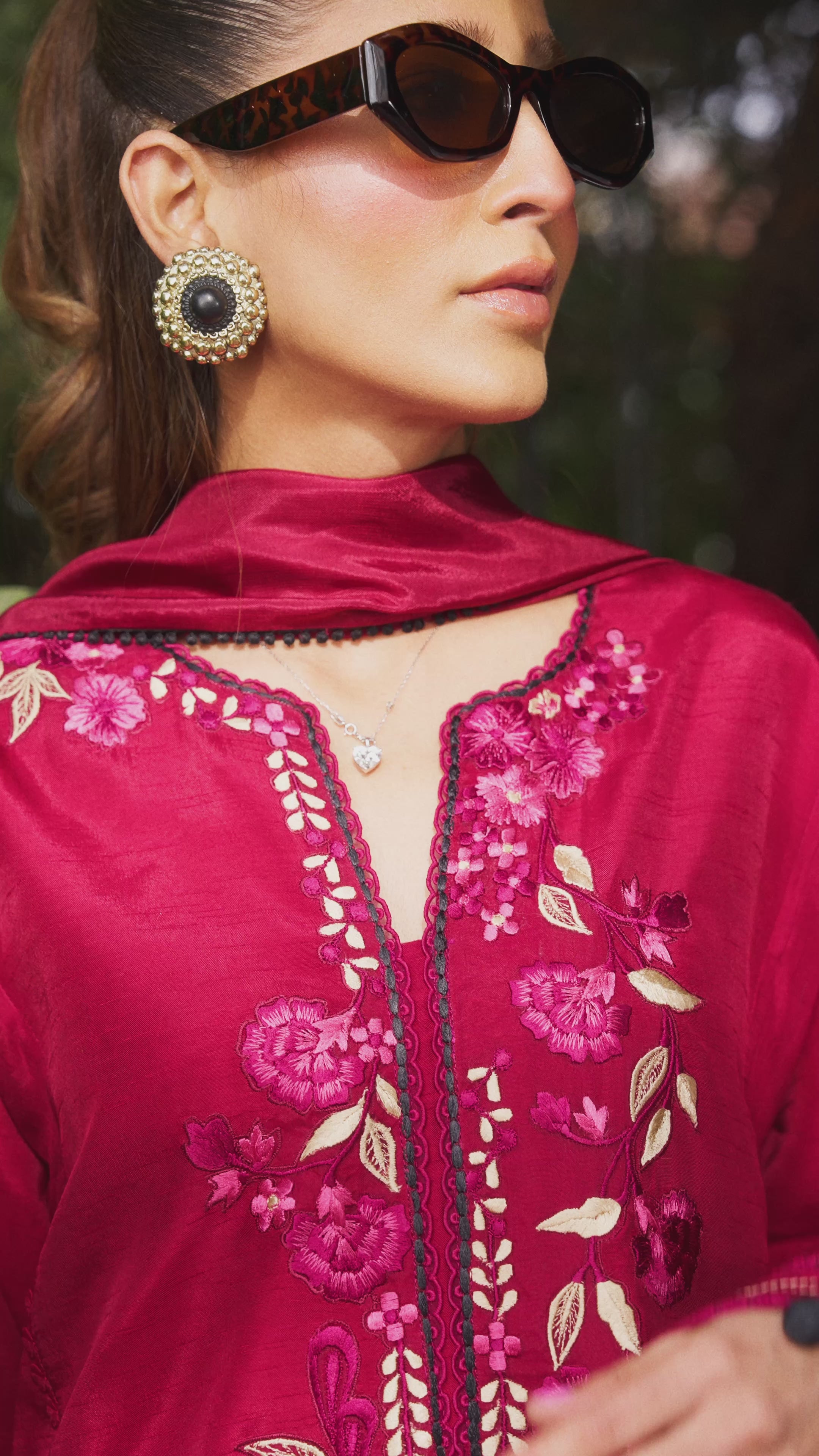 Tanaz, the deep magenta ensemble is made in pure bamber raw silk with black, white and maroon embroideries. The panelled kurta comes with an izaar and silk dupatta with delicate corner embroidery detailing.