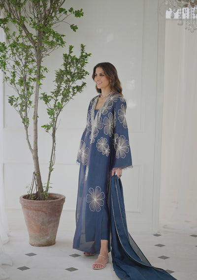 Ziana, the Delft blue boxy kurta comes with asymmetrical floral embroideries and a tasseled neckline on pure butter silk. It comes with matching cigarette pants and a medium silk dupatta.